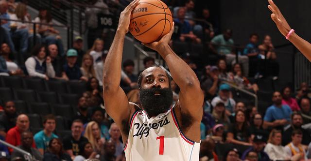 快船當家球星詹姆斯·哈登打滿首節(jié),12投9中三分線外7中5,罰球6罰4中,砍下27分。